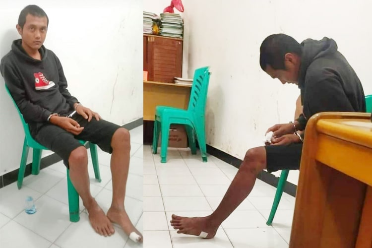 Kedua tangannya tampak diborgol, dan jari jempol kaki kanannya terlihat dibalut perban.
